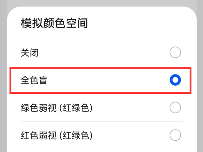 3、进入“模拟颜色空间”,勾选“全色盲”选项即可。