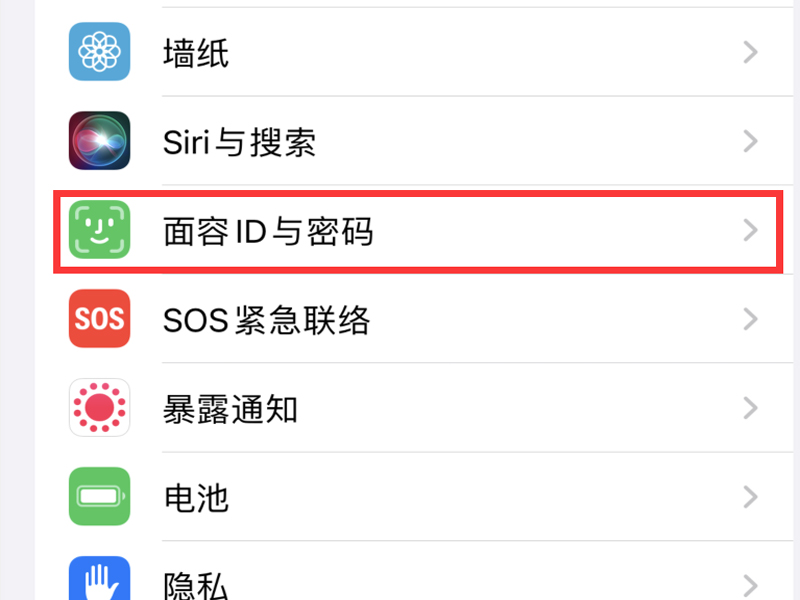 1、打开手机的设置,点击“面容ID与密码”的按钮,进入面容ID与密码的设置页面中。