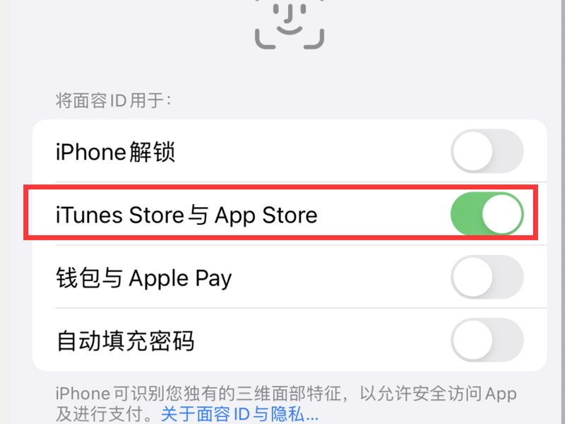 2、把页面中的“iTunes Store与App Store”的开关打开即可。