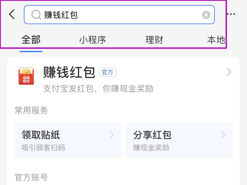 1、打开支付宝,在上方搜索框中搜索赚钱红包并且点击进入。