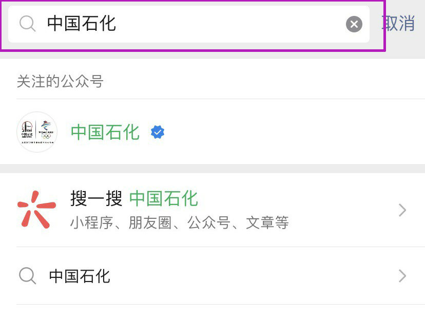 2、在微信中搜索中国石化,然后进入中国石化的公众号。