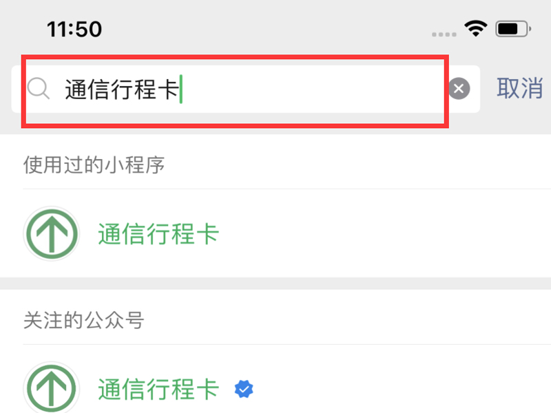 2、在上方的搜索框中输入文字“通信行程卡”,搜索小程序。