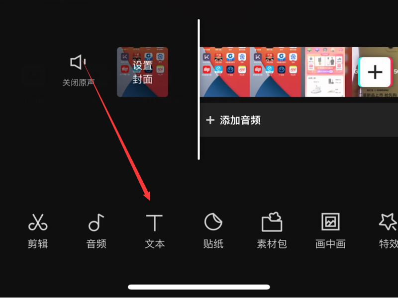 2、添加素材后进入创作页面,点击下方的“文本”按钮,弹出文本工具栏。