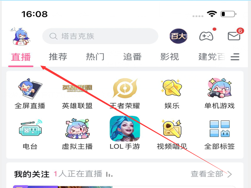 1、打开哔哩哔哩app,进入左上角的“直播”页面。