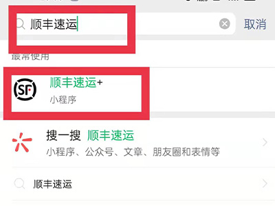 1、打开微信首页,在顶部搜索按钮内搜索并进入“顺丰速运+””公众号。
