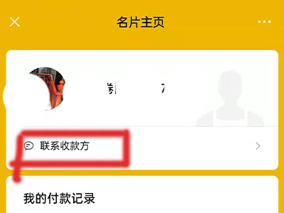 4、点击收款方服务下方的收款方名片,点击联系收款方。
