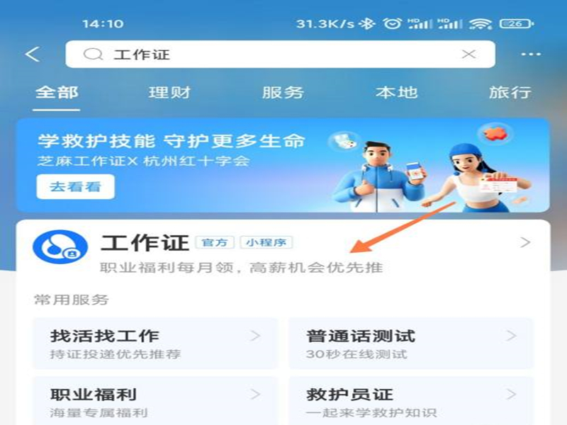 1、在支付宝中搜索并选择“工作证”。