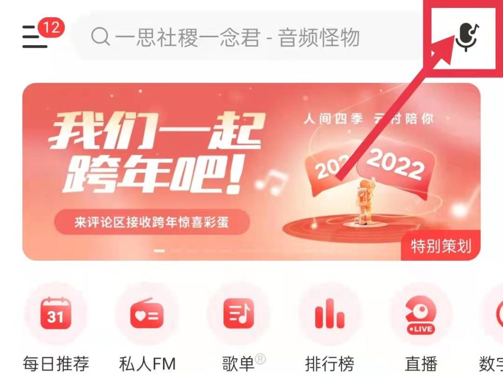 1、打开网易云,点击右上角的麦克风标志。