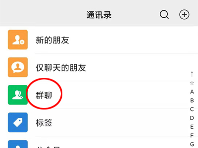 2、在通讯录页面中点击“群聊”,进入群聊页面。