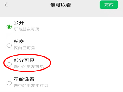 4、点击“部分可见”,选择可见该条朋友圈的好友。
