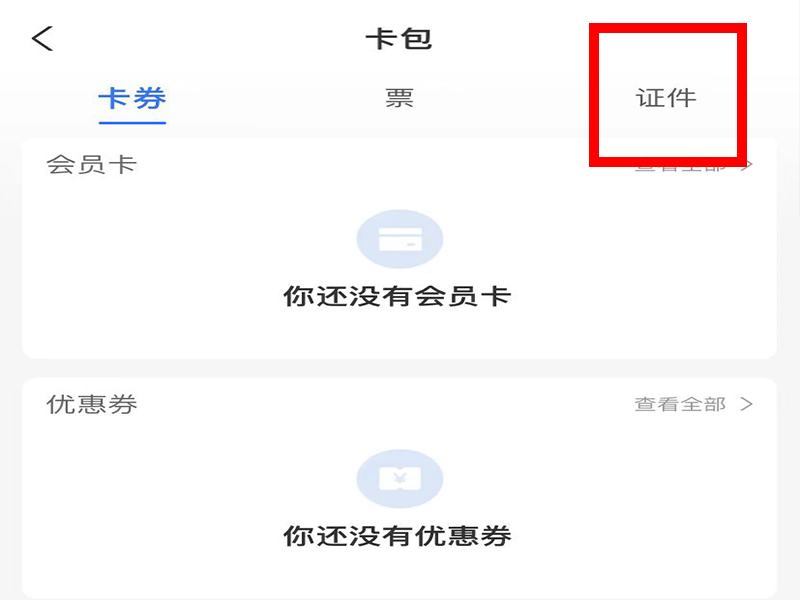 2、进入“卡包”界面后,点击“证件”。