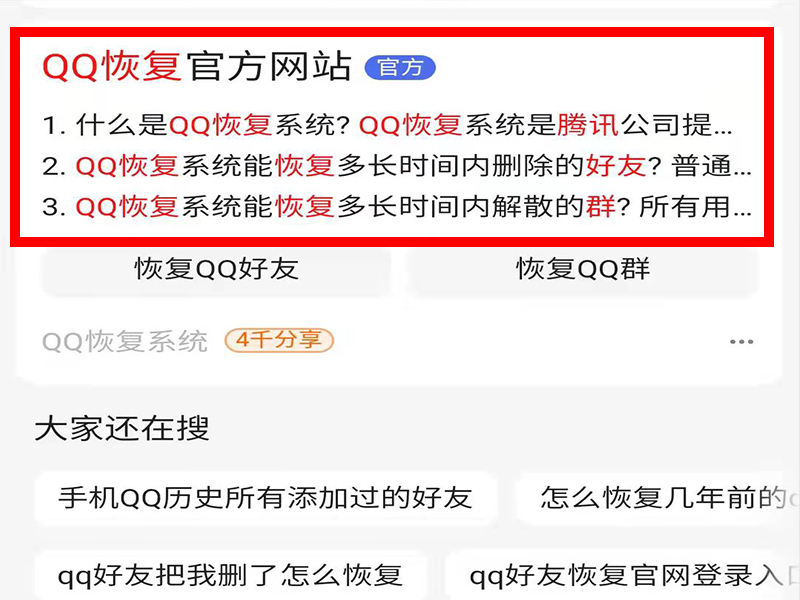 用百度搜索并登录QQ恢复官方网站的具体操作方式如下:1、打开百度app,搜索并登录“QQ恢复官方网站”。2、进入“QQ恢复官方网站”后,找到并点击“恢复QQ群”。3、进入“恢复QQ群”界面后,选择想要恢复的群聊即可。