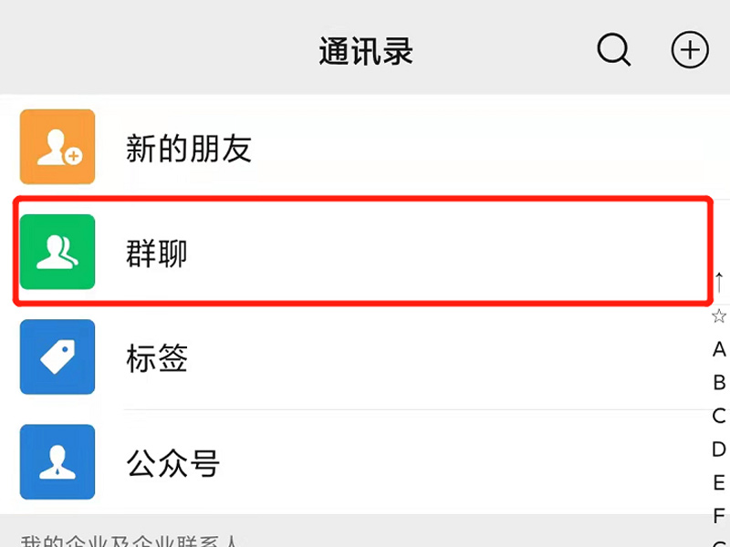 1、打开微信app,点击下方的通讯录,再点击上方的群聊。