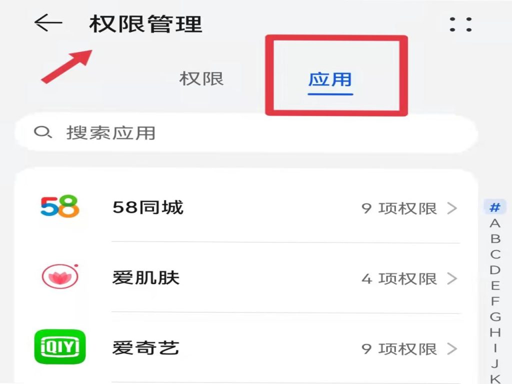 2、点击“权限管理”,选择“应用”。