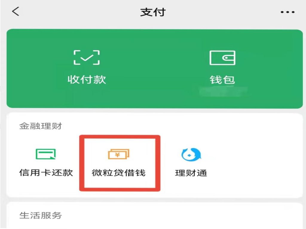 2、在支付页面的金融理财选项中,选择点击“微粒贷借钱”。
