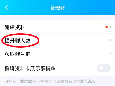 5、在管理群页面点击“提升群人数”,群人数越多,群管理员也就会越多。