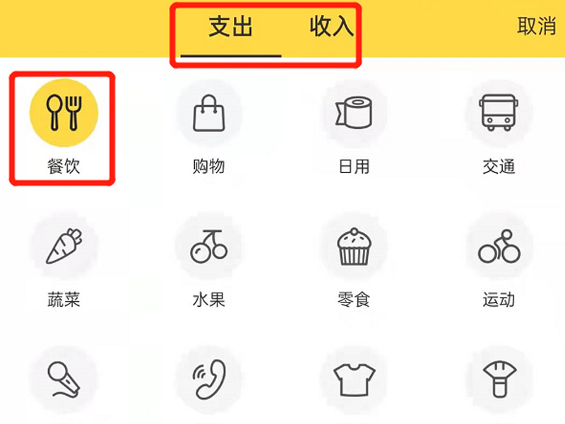2、选择支出或收入项目,选择类型。
