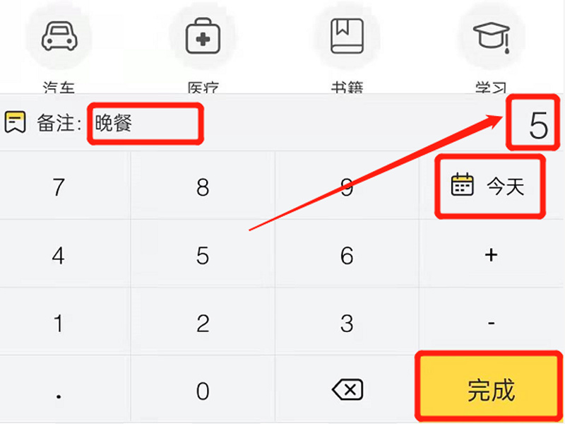 3、在记账框注明资金用途、打上金额、选择日期等,点击“完成”即记账成功。