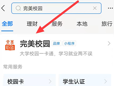 1、打开手机支付宝app,搜索并进入完美校园小程序。