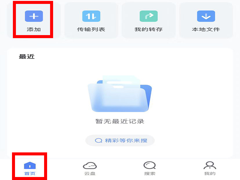 1、打开迅雷app,进入“首页”界面后,点击左上角的“添加”。