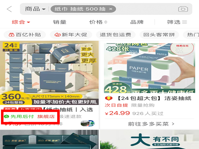 3、在搜索结果界面,如果商品有“先用后付”的标识,则说明该商品是先用后付商品。