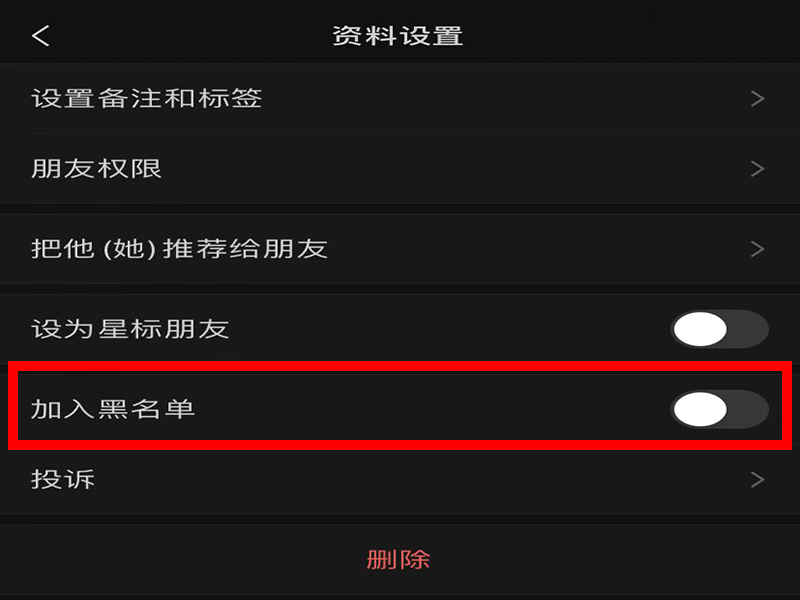 3、在“资料设置”界面点击“加入黑名单”旁边的符号即可。