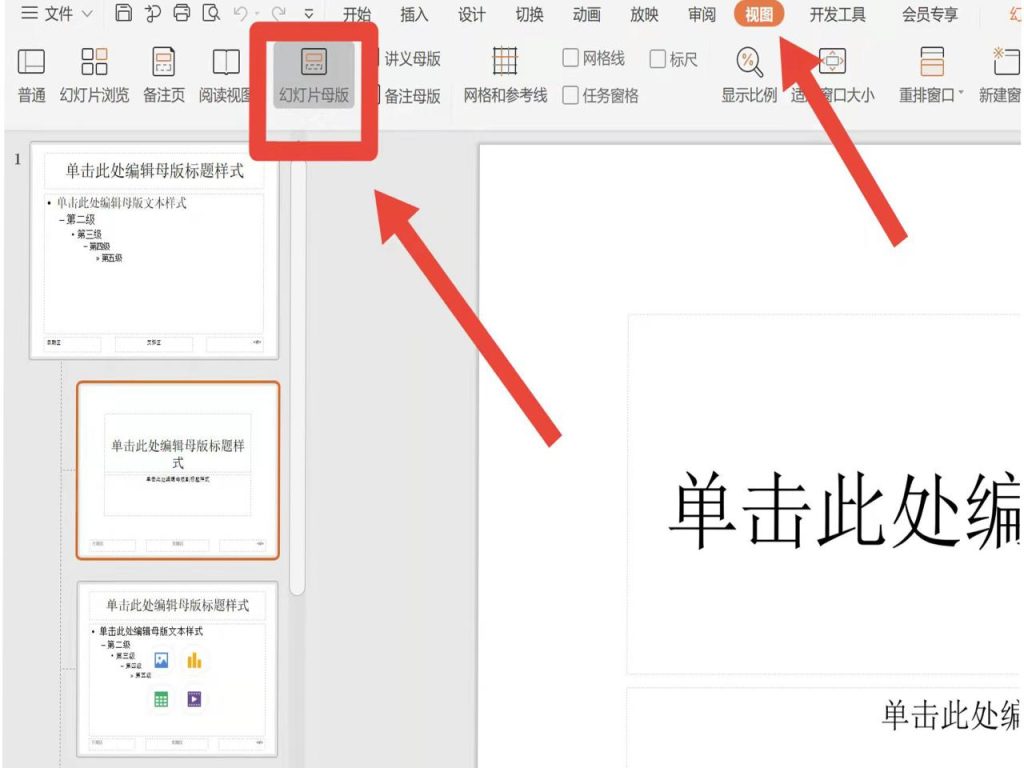 2、点击视图工具栏的“幻灯片母版”,进入母版编辑状态。