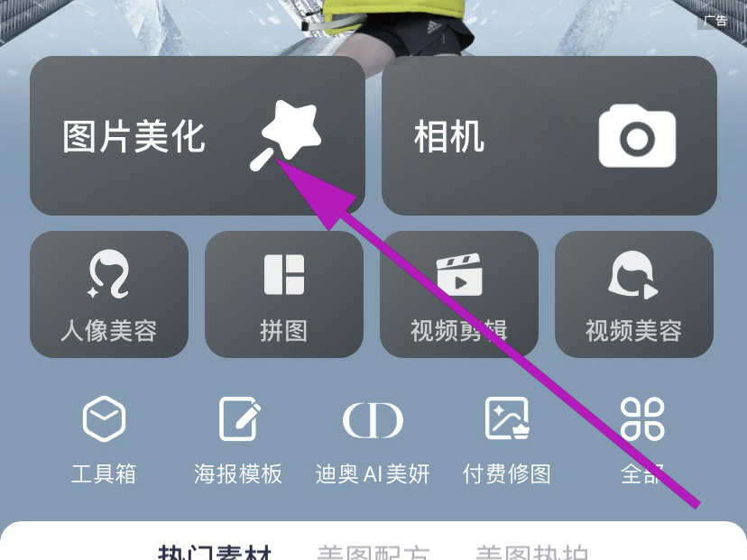 1、打开美图秀秀,在主界面中找到图片美化选项,然后点击进入。