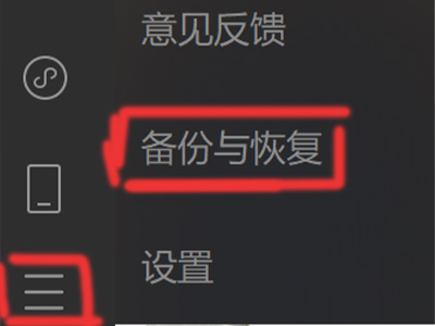 1、打开的电脑版微信,点击左下角“三”形按钮,点击“备份与恢复”。