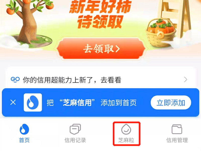 2、进入芝麻信用界面后,点击下方的芝麻粒。