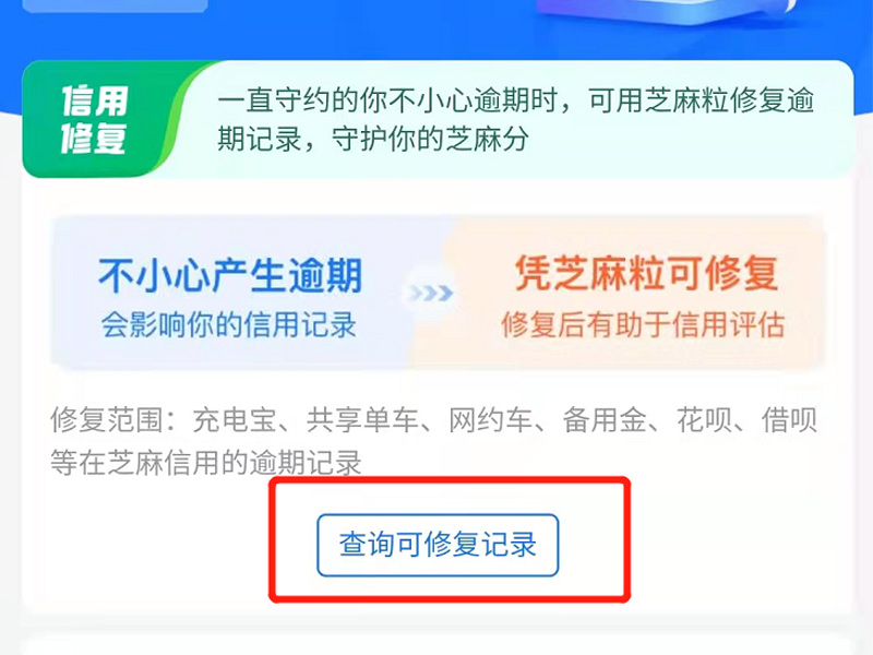 3、点击芝麻粒后,找到逾期记录修复并打开。