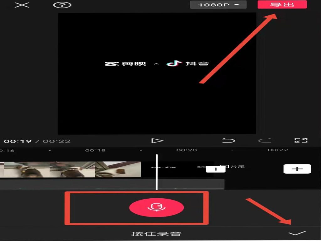 4、长按录音按钮进行配音,点击右下角的“√”图标,再点击右上角的“导出”,视频即可完成配音。