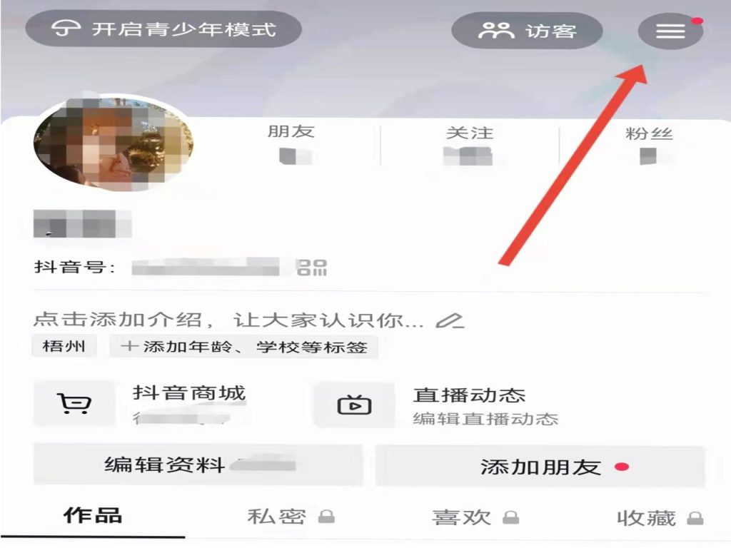 1、打开抖音,切换到“我”的页面,点击右上角的三横图标。