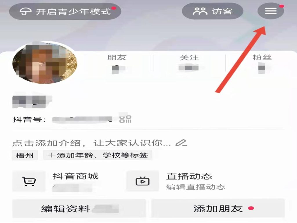 1、打开抖音,切换到“我”的页面,点击右上角的三横图标。