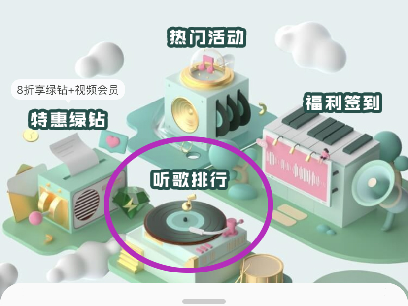 3、找到活动中心页面当中的“听歌排行”,然后点击进入。