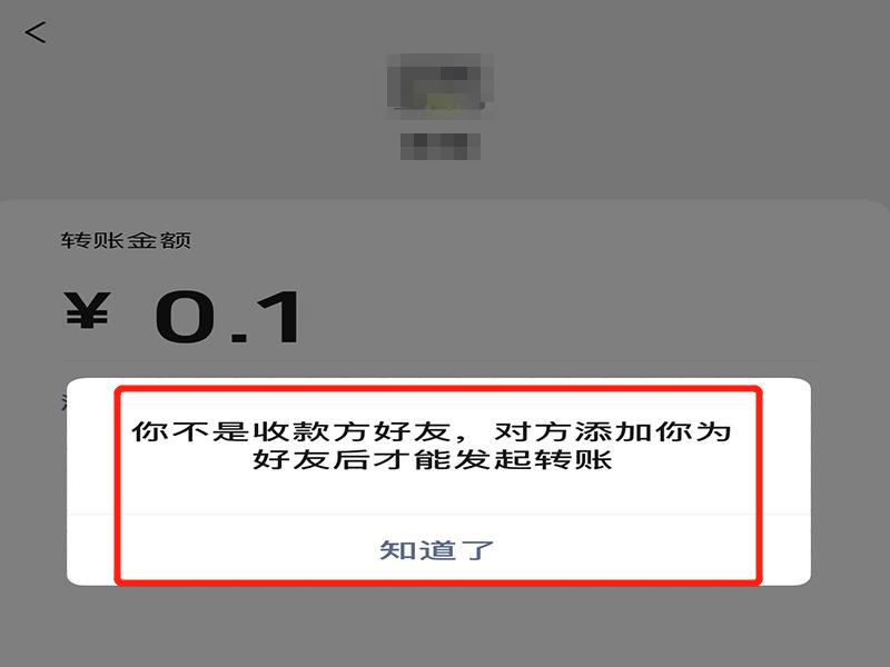 4、输入金额转账,即会弹出对方不是你的好友提示,即表示已被对方删除,若无提示即表示对方已将你屏蔽。
