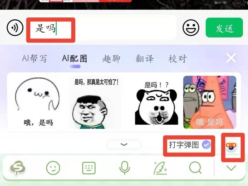 2、在对话框中输入任意文字,点击搜狗图标,勾选“打字弹图”。