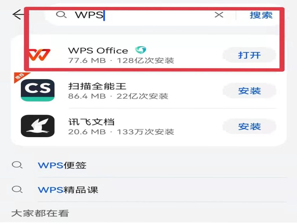 1、进入手机应用市场,搜索wps office软件,进行下载和安装。