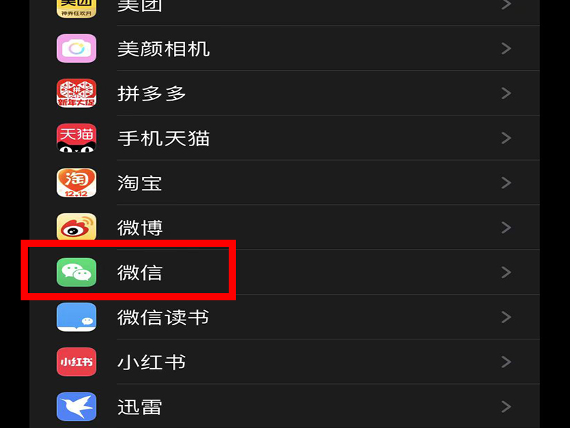 2、进入“设置”界面后,拖动屏幕往下滑找到找到并点击“微信”选项。