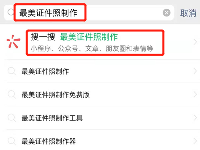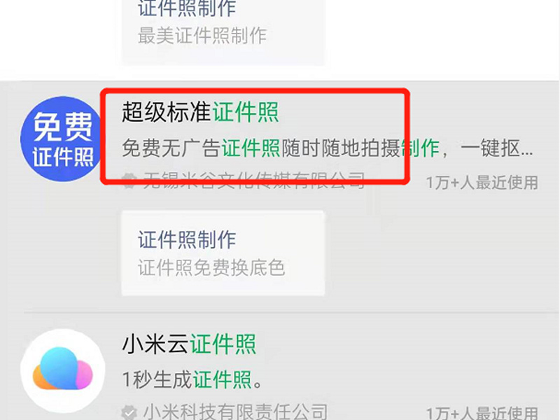 2、输入“最美证件照制作”,点击搜索,得出结果后再点击“超级标准证件照”。
