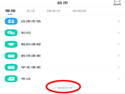 1、打开并登录学习通APP,切换到“首页”,点击中部位置的“编辑常用”。
