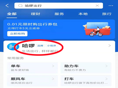 1、打开支付宝,切换到首页,在搜索框内输入“哈啰出行”。