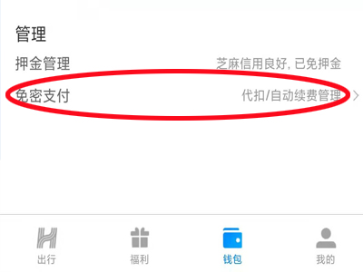 3、进入小程序后,切换到“钱包”,点击“免密支付”,进入免密支付。