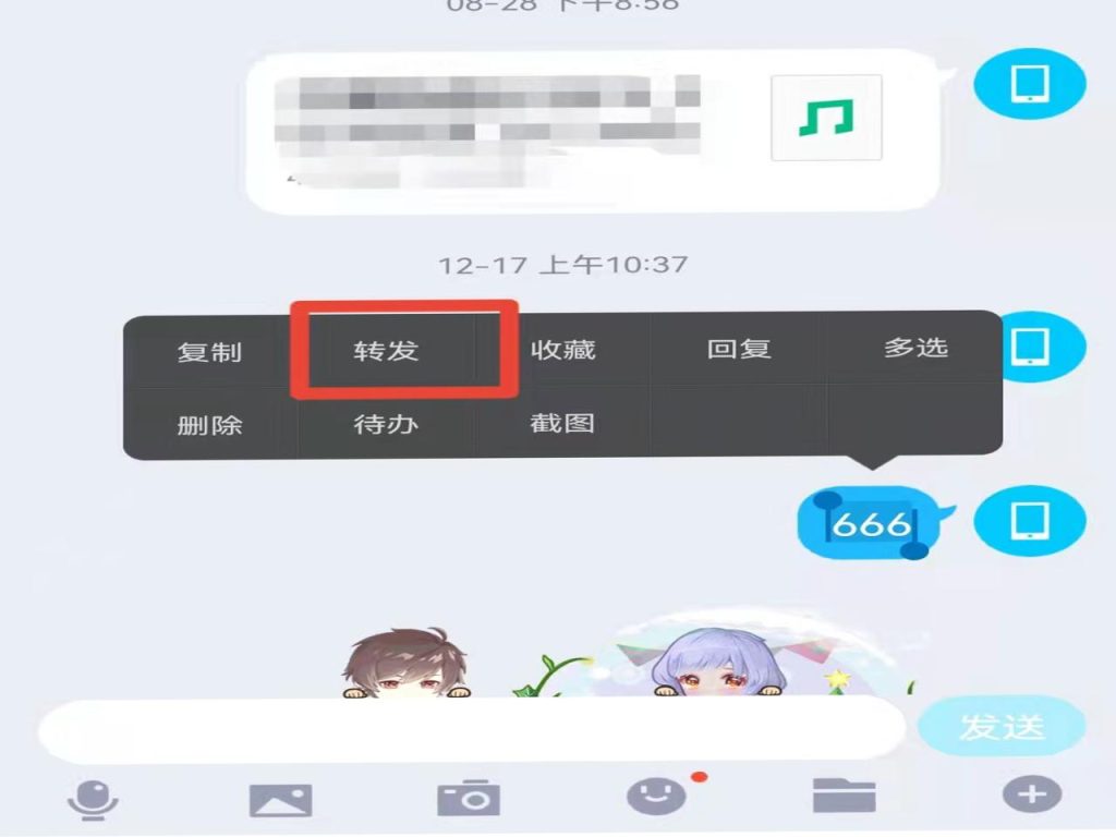 3、长按已发送的消息,在弹出的选项中点击“转发”。