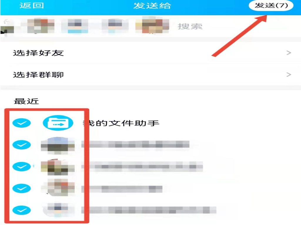 5、选择需要发送的QQ好友或群聊,点击右上角的“发送”即可完成群发。