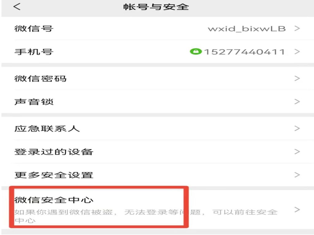 3、在账号与安全页面,点击下方的“微信安全中心”。