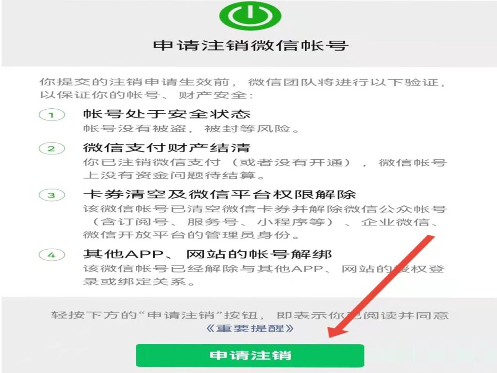 5、点击“申请注销”,满足注销条件即可完成微信号的注销。