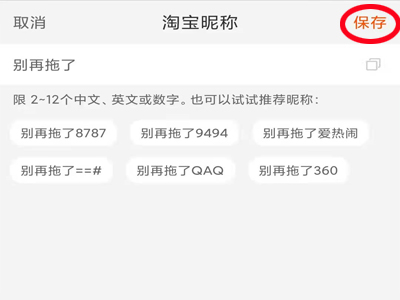 4、编辑完昵称后,点击右上角的“保存”按钮,即可以完成淘宝昵称的修改。