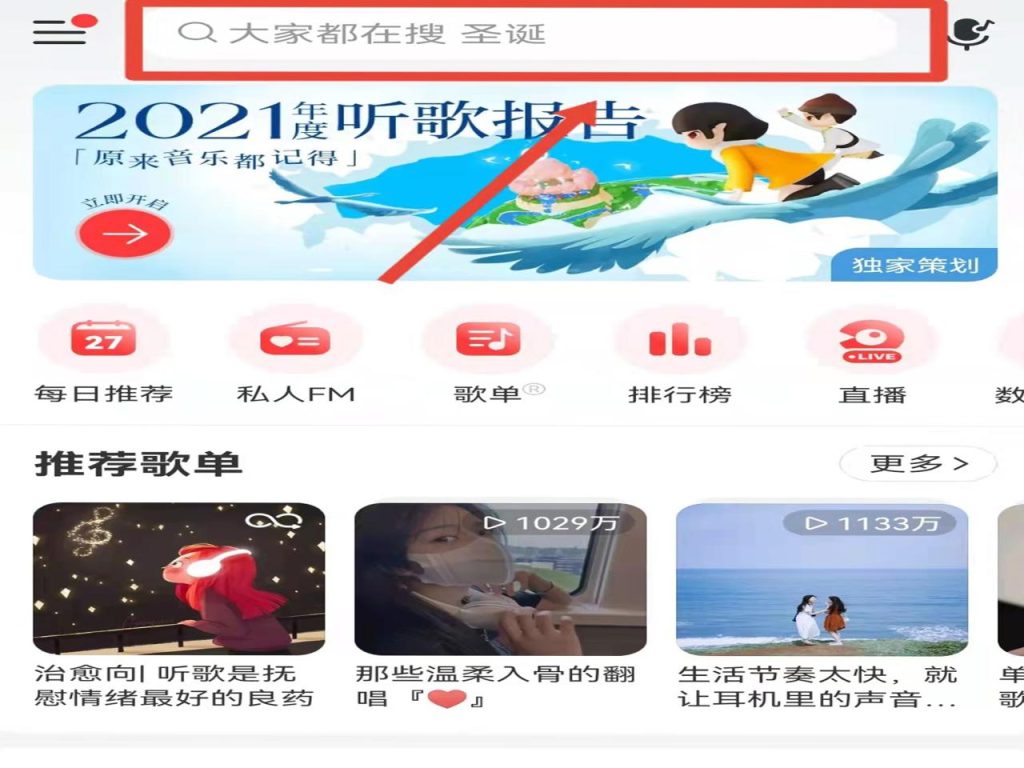 1、打开手机网易云音乐APP,点击上方的搜索栏。