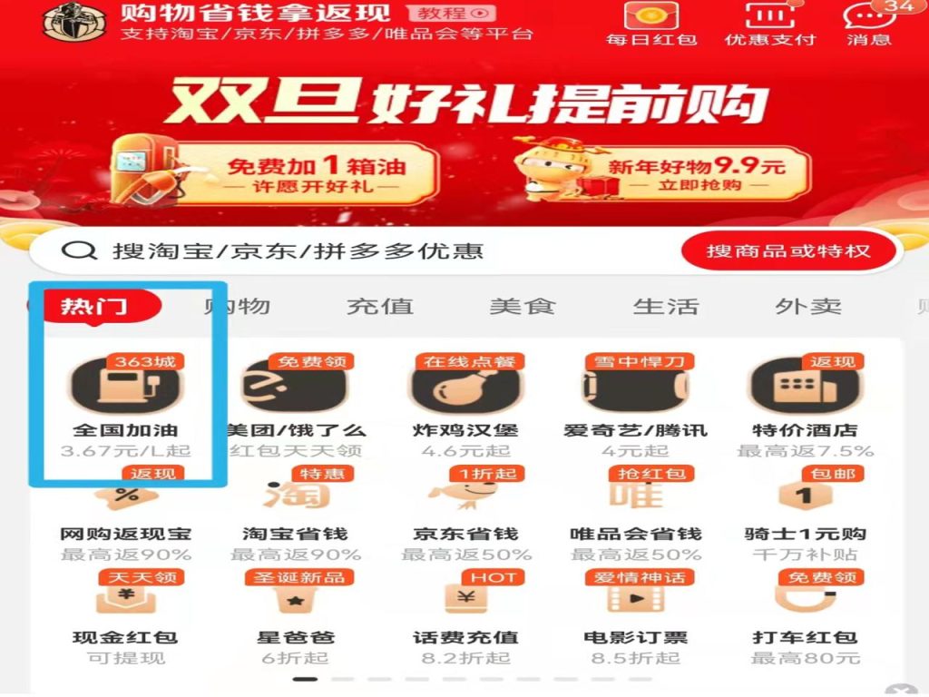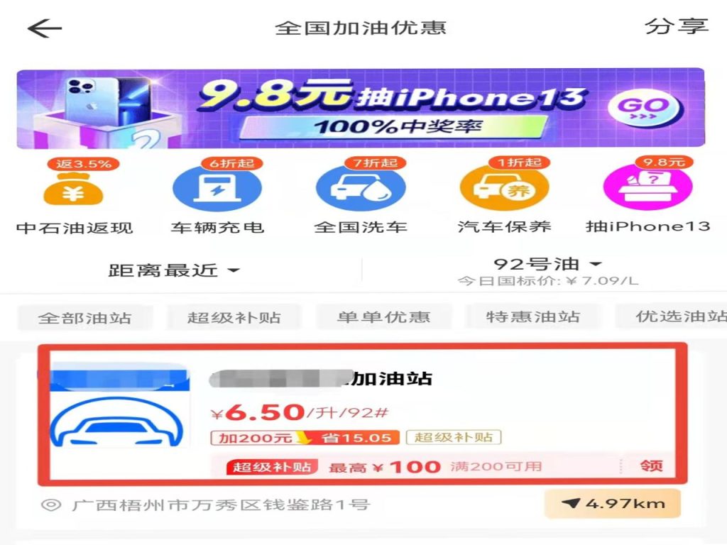 2、点击“全国加油”,选择优惠力度和口碑较好的加油站。